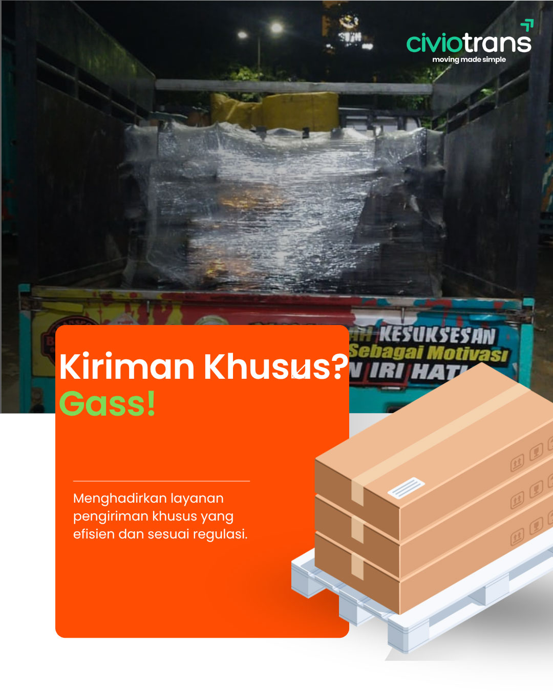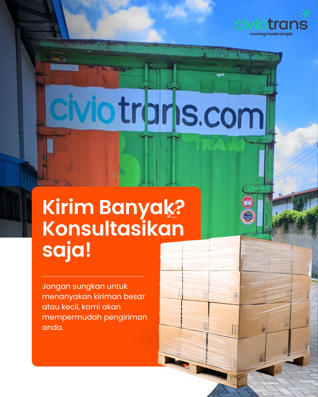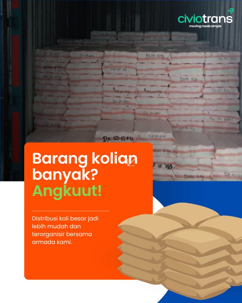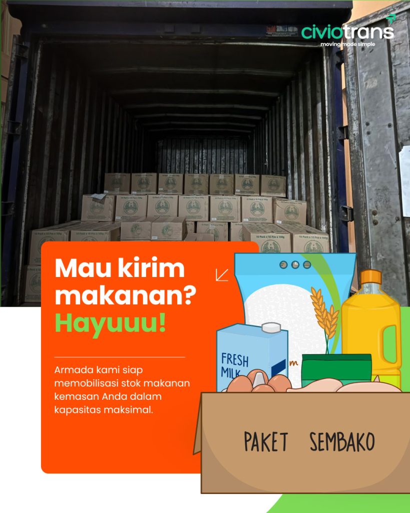 Solusi jasa pengiriman kargo terbaik yang menyediakan jasa trucking dan pengiriman container untuk kebutuhan logistik bisnis anda. Kami selalu siap memberikan layanan pengiriman cargo cepat setiap saat dengan tarif kiriman cargo murah untuk membuat rantai pasok bisnis anda semakin efisien. Tidak seperti pengiriman cargo temurah lainnya, Civiotrans berkomitmen untuk menjadi jasa kirim cargo yang tidak hanya murah tetapi juga solutif bagi masalah pengiriman barang anda.