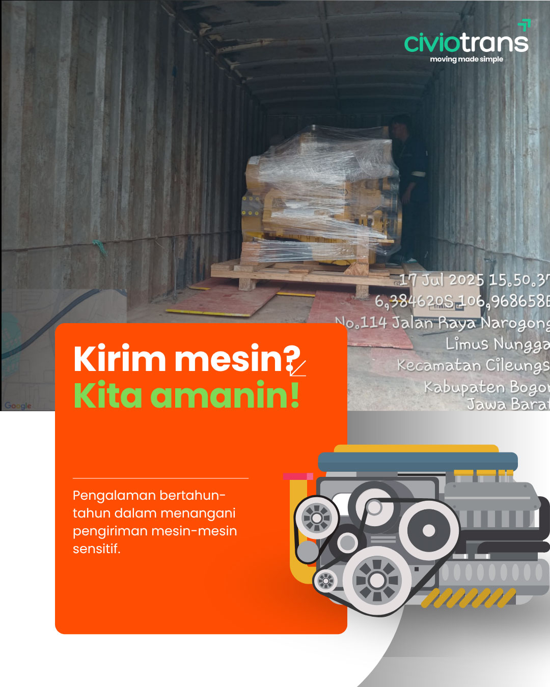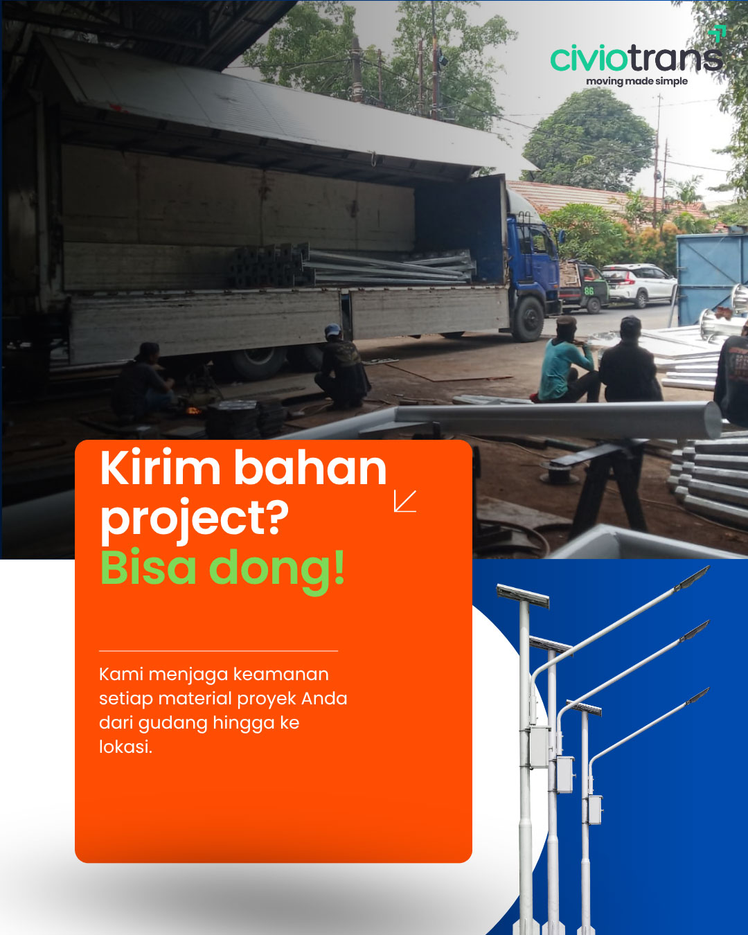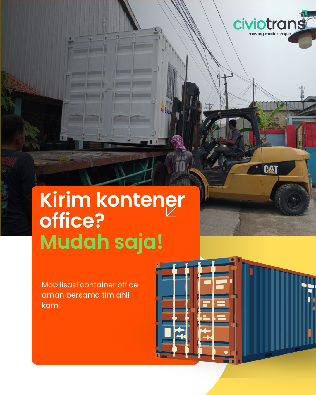Solusi jasa pengiriman kargo terbaik yang menyediakan jasa trucking dan pengiriman container untuk kebutuhan logistik bisnis anda. Kami selalu siap memberikan layanan pengiriman cargo cepat setiap saat dengan tarif kiriman cargo murah untuk membuat rantai pasok bisnis anda semakin efisien. Tidak seperti pengiriman cargo temurah lainnya, Civiotrans berkomitmen untuk menjadi jasa kirim cargo yang tidak hanya murah tetapi juga solutif bagi masalah pengiriman barang anda.